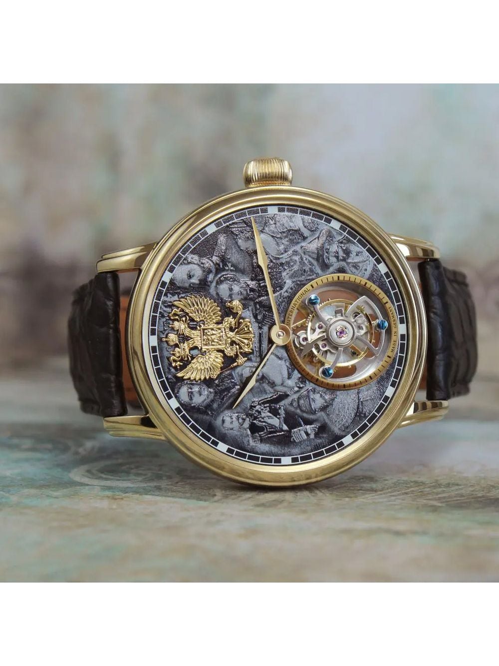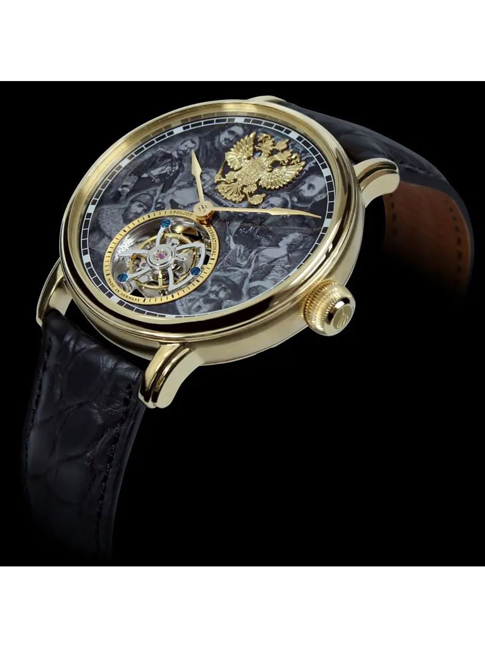 • Zifferblatt in dunklen Grautönen mit 3D-Druck der Zarenfamilie, goldfarbenen Verzierungen sowie Sicht auf die Unruh